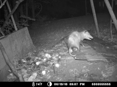 Ik gebruik voor mijn inventarisatiewerk af en toe automatische cameras die een foto maken als iets of iemand door de infrarode straal voor de camera loopt. Een van mijn cameras leek niet meer zo goed te werken en ik had hem even uit het reservaat gehaald om 'm te testen. Aangezien we een week of twee geleden weer eens een zwarte beer in onze tuin hadden en omdat de etensresten in onze composthoop wel heel erg snel verdwenen de laatste tijd dacht ik dat het misschien wel interessant zou zijn om daar de camera eens neer te hangen. Na vier dagen en nachten had de camera maar liefst 253 foto's gemaakt! Blijkbaar een populaire plek...