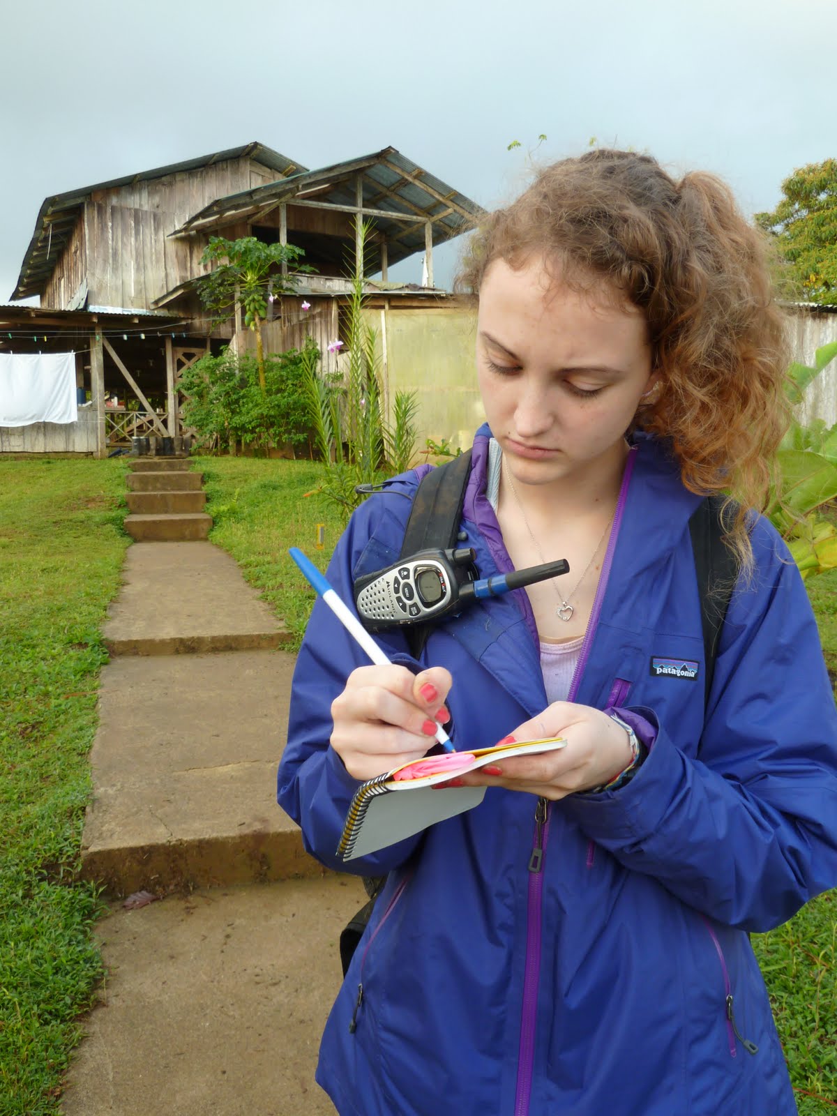 Typisch tafereel als ik in het gebouw ben: de kapstok hangt vol met mijn machete en slangenhaken en er staat een groot glas zwarte koffie op de reling!