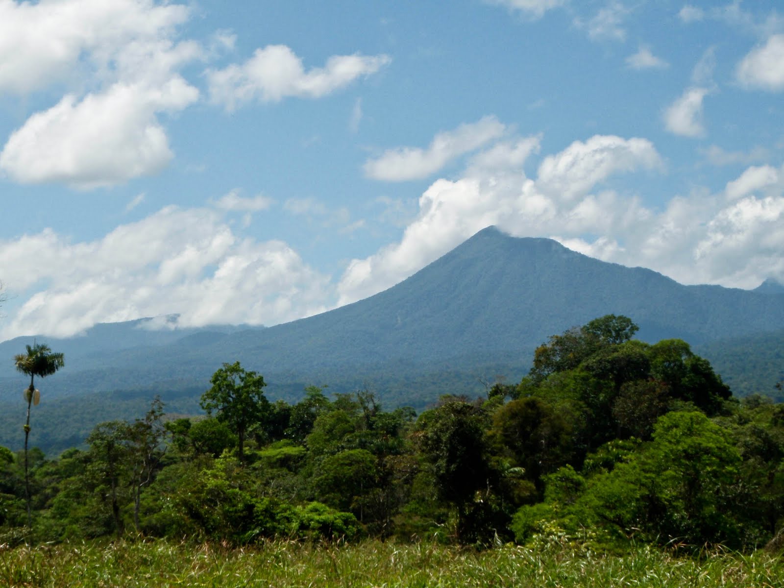 Een blik over mijn schouder: uitzicht op 'onze' vulkaan terwijl we alweer halverwege op weg zijn naar de bewoonde wereld....